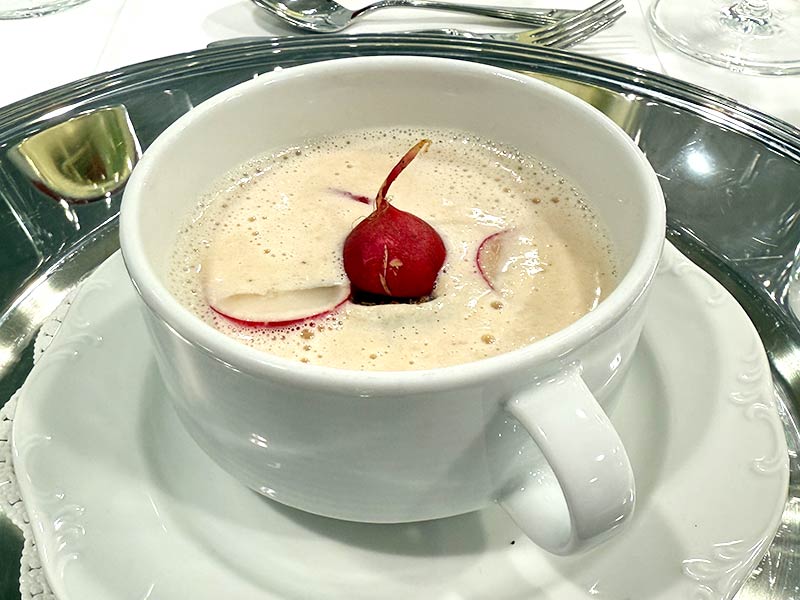 25. September 2025 von wl ← Vorheriges Bild Nächstes Bild → Radieschenschaumsuppe mit panierter Blutwursteinlage